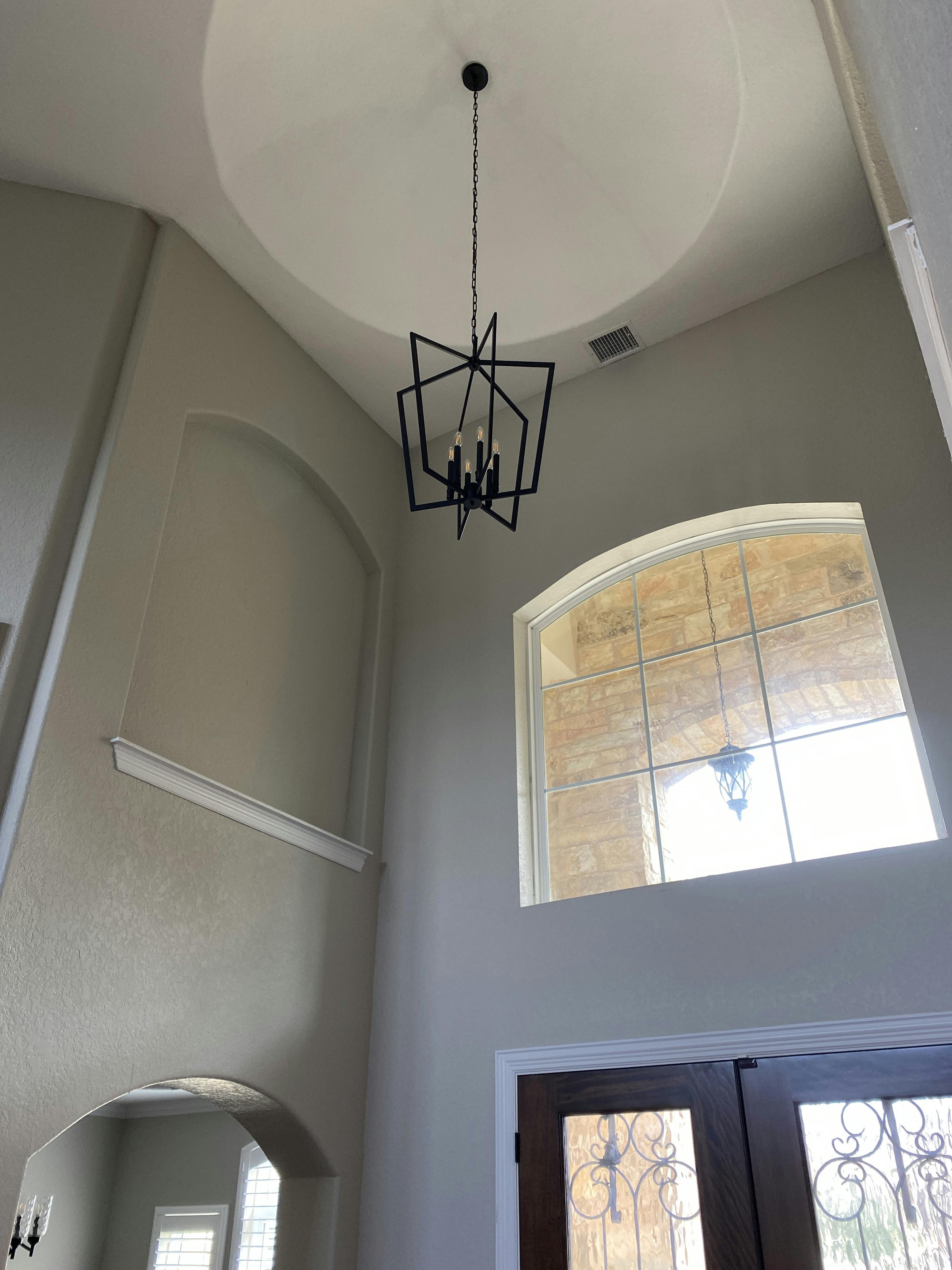 The open cage style of Abbotswell 6 light chandelier makes maximum impact with minimal lines. Intersecting pentagons in a rich Matte Black finish create a look that works in a variety of decors: updated traditional, transitional or modern farmhouse.