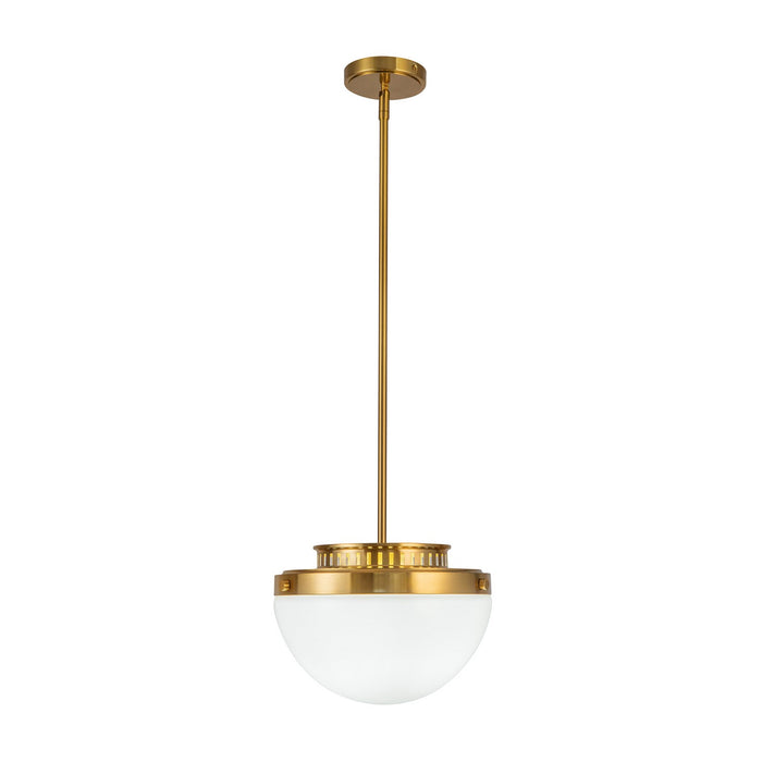 The Dahlia Pendant by Kevin Kraemer showcases a refined design, featuring a rich brass frame complemented by pristine white glassware. Designed with versatility in mind, it includes a "hang-straight" mechanism, giving it the ability to hang on level or sloped ceilings. This pendant light adds a touch of understated sophistication to any kitchen, island etc...