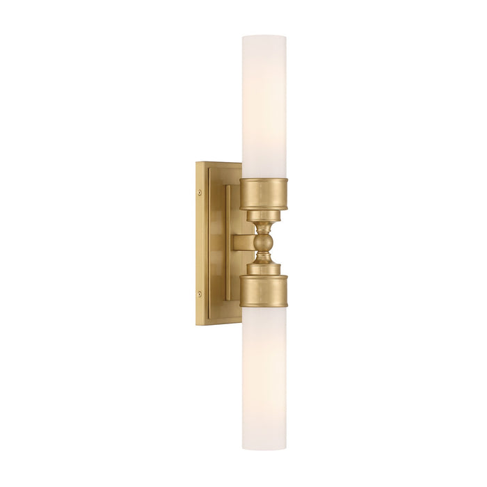 The Wilcox collection includes a white cylindrical glass shade and a rectangular back plate with stepped detailing. It is damp-listed for safe use in moisture-prone areas. The collection offers a single light option, suitable for mounting on either side of a mirror, and a double light option, perfect for placing over a vanity. This elegant fixture adds a sophisticated touch to bathroom spaces.