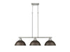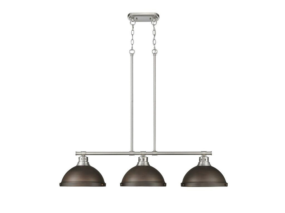 The Duncan collection is contemporary style with an industrial feel. The collection features a variety of simple, traditional silhouettes that are a nod to a bygone era. Transform the look of your room with these classic, vintage-inspired fixtures. A variety of plated and painted metal shade finishes are offered in choice combinations. This 3-light linear pendant features frosted glass diffusers for warm task lighting over a bar or nook.