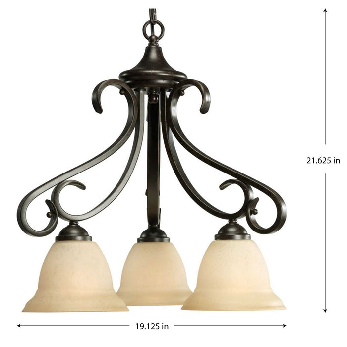 Three-light chandelier with tea stained oversized, bell-shaped glass bowls. Distinctive ebbing and flowing of squared scrolls and arms in Forged Bronze finish.