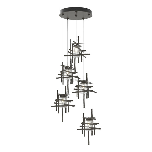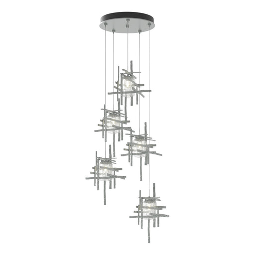Original price $5,585.80 - Original price $5,585.80Original pricecurrent price $5,585.80$5,585.80 - $5,585.80Current price current price $5,585.80Thick, seeded clear glass shades are nestled within each of the Tura 5-Light Pendant's modern, open, cage-like individual pendants. Perpendicular, ...