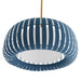 Inspired by the uniqueness our Mia Pendant (41005) imparts upon a space we`ve created this colorful take in a different shape. Strips of pliable blue cadet microfiber banding surround the light which is suspended from a steel pipe finished in a warm antique brass. The styrene shape is not only aesthetically engaging but it filters the light and casts soft linear shadows. Additional pipe available (PIPE-101).