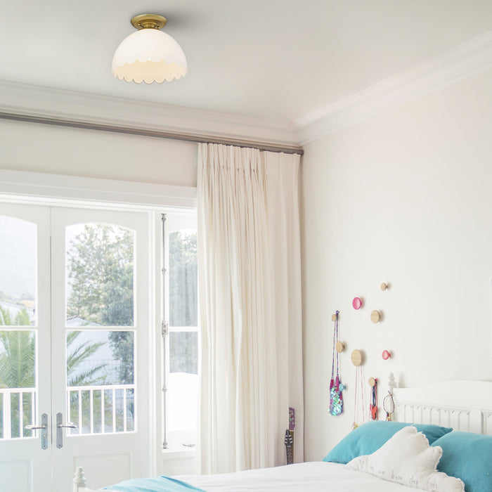 Dorinda's transitional design is fit for a variety of decors. The scalloped opal glass shade gives the fixture a gentle, whimsical feel. When lit, the smooth glass glows warmly. Vintage-inspired and paired with select finishes, Dorinda has a sweet, classic look that is ready to grace your home.