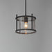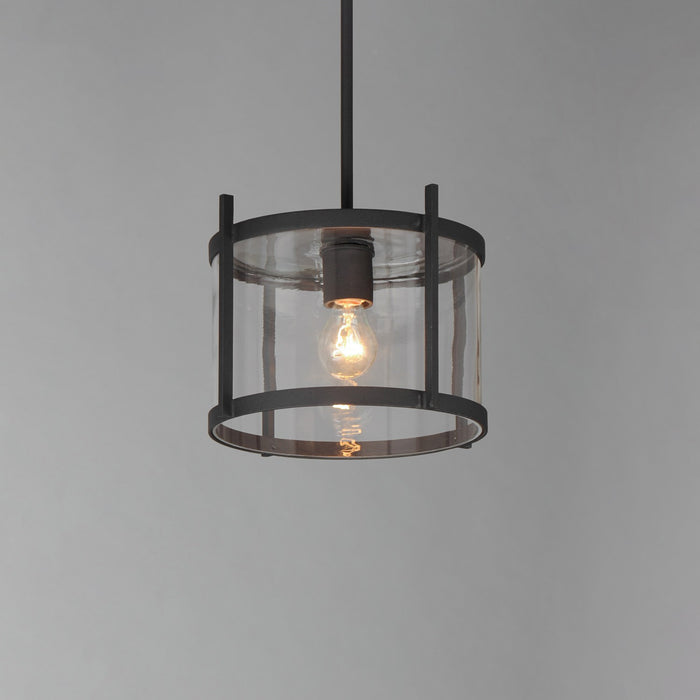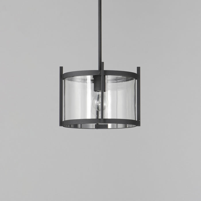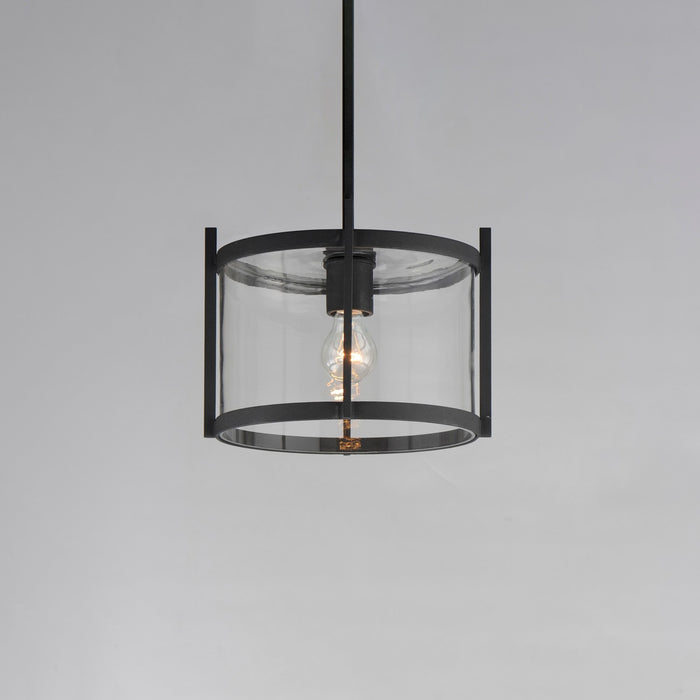 Squared columns in Matte Black finish tower above the cylindrical glass shade rated for outdoor applications. A rectangular hook detail carries the square form through to the backplate. A modern interpretation of a bell tower, these outdoor pendants and sconces are a cleaned up, transitional look for exteriors.