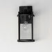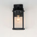 Squared columns in Matte Black finish tower above the cylindrical glass shade rated for outdoor applications. A rectangular hook detail carries the square form through to the backplate. A modern interpretation of a bell tower, these outdoor pendants and sconces are a cleaned up, transitional look for exteriors.