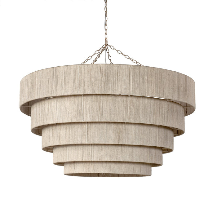 Natural fine abaca rope hand-woven over a powder-coated metal frame. The oversized chandelier comes with a taupe-finished chain and canopy hanging kit. Professional installation recommended. Coordinates with the Everly collection.