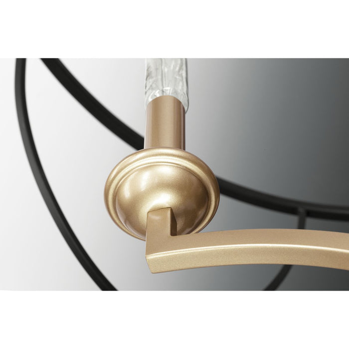View full detailsA five-light inner cluster in Brushed Brass appears to float inside a Black geometric outer cage in this Landree Collection chandelier. The frame i...