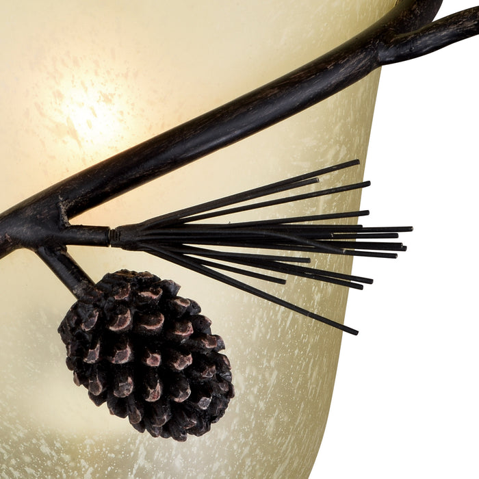 The Sierra collection combines rustic and classic styling that brings nature indoors. Great for lodges, cabins, and nature-styled interiors, this fixture features black walnut finish and frosted scavo glass, with twisted wire rope and pine tree elements.