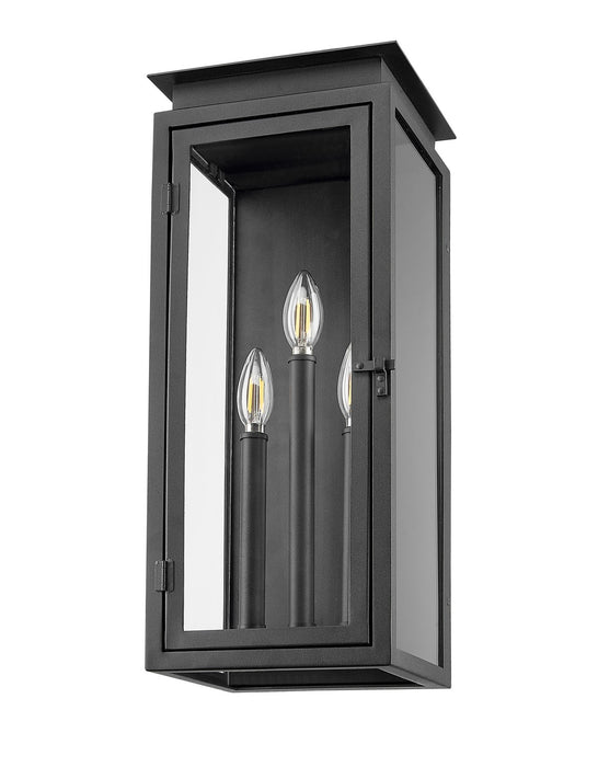 Offer stylish character to your exterior with this transitional three-light outdoor wall light. A lantern profile is paired with a layered cap and stepped trim, all on a coastal black finish that adds excellent durability. The lantern includes candelabra light within and glass panels for excellent illumination.